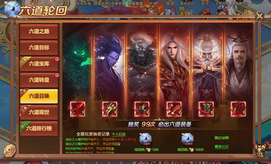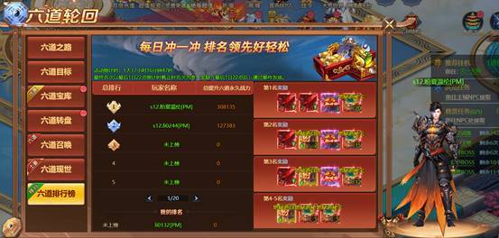 l 根据六道战力进行排行,可获得稀有六道装备和稀有称号