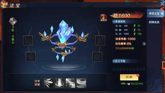 n 所有法宝可通过消耗钻石可以提升法宝的阶数,提升阶数可提高法宝属性